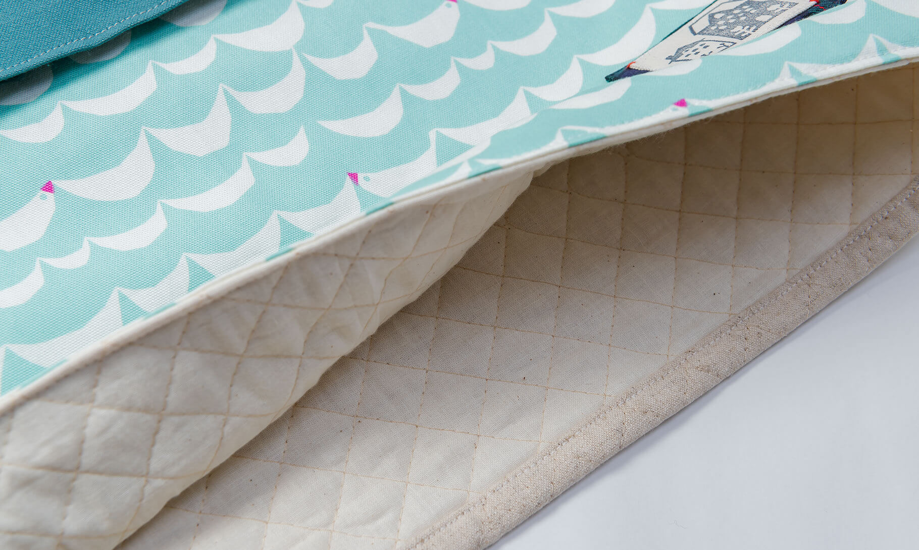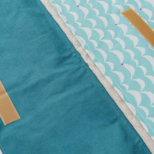 帆布11号アクアマリンカラーのフタ部分、本体は北欧風の文鳥の生地で防災頭巾カバーをオーダーいただきました。