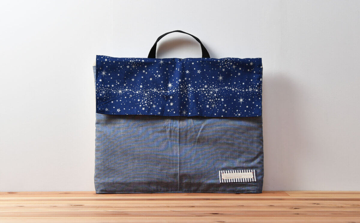 シンプルな生地ダンガリーと、夜空に星が瞬いているような生地を組み合わせた、防災頭巾カバーのオーダーをご紹介させていただきます。