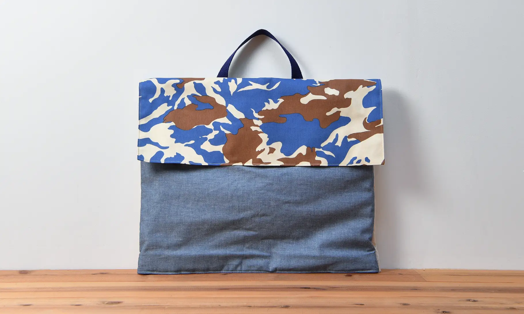 ふたの生地には「9081/サファリカモフラ」、本体の生地には「0673/無地/ダンガリー」をお選びいただいております。