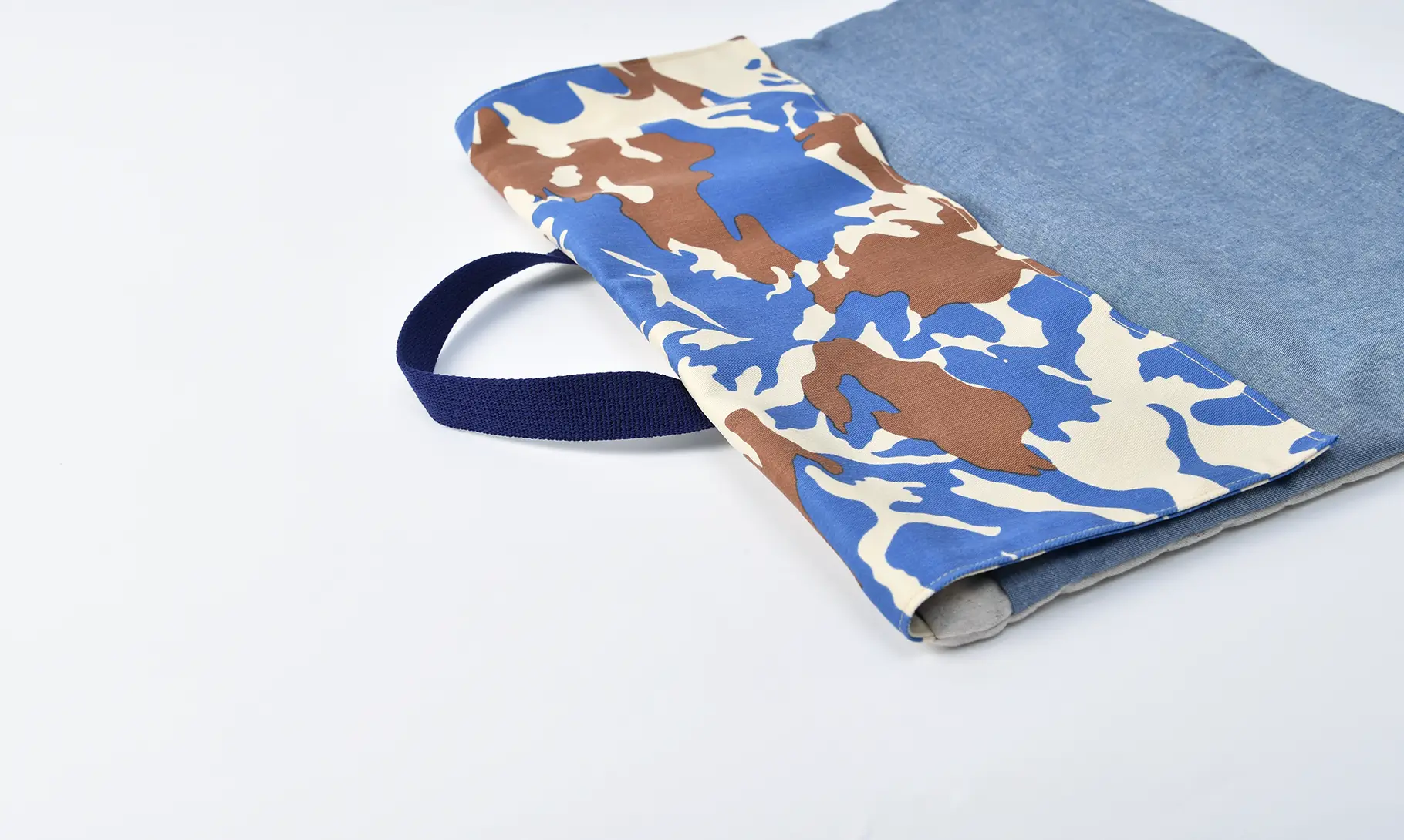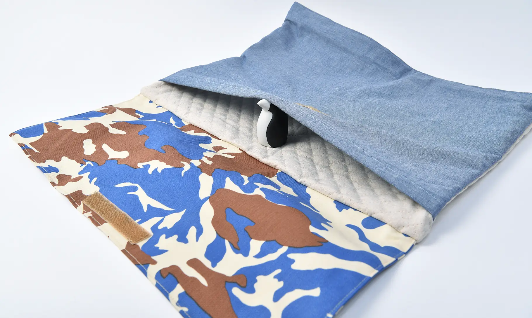 今回は、アクティブな印象のブルー×ブラウンのカモフラージュ柄と、シンプルな無地の生地を組み合わせた防災頭巾カバーをオーダーいただきました。