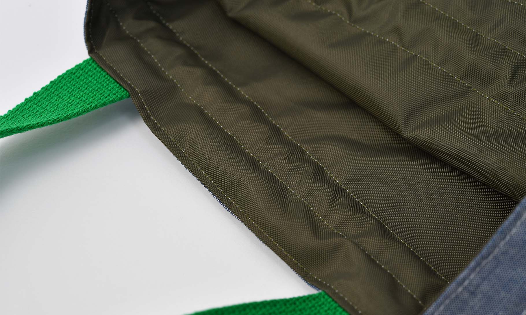 今回お客様のご要望により、お持ち込みの生地(ナイロン、ダークグリーン)の裏地を使用し、お作りさせていただきました。
