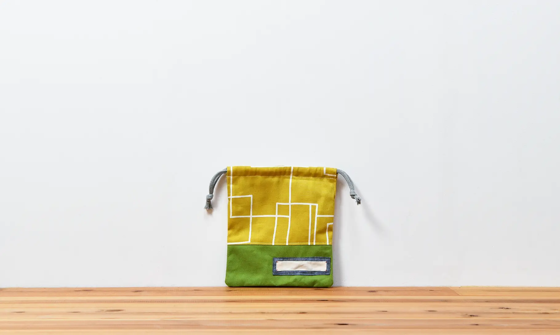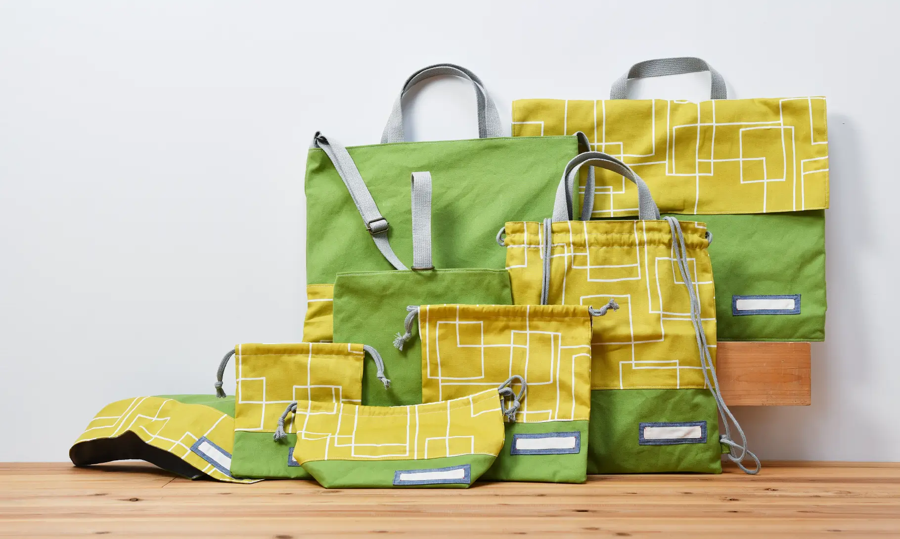 今回のオーダーは、カクカクとした幾何学模様のような生地「0586/カクカクラインとくすんだイエロー」と、シンプルで丈夫な帆布生地「9065/帆布11号/グリーン」をメインに組み合わせた素敵な入園グッズセットに仕上がりましたので、一つずつ紹介いたします!