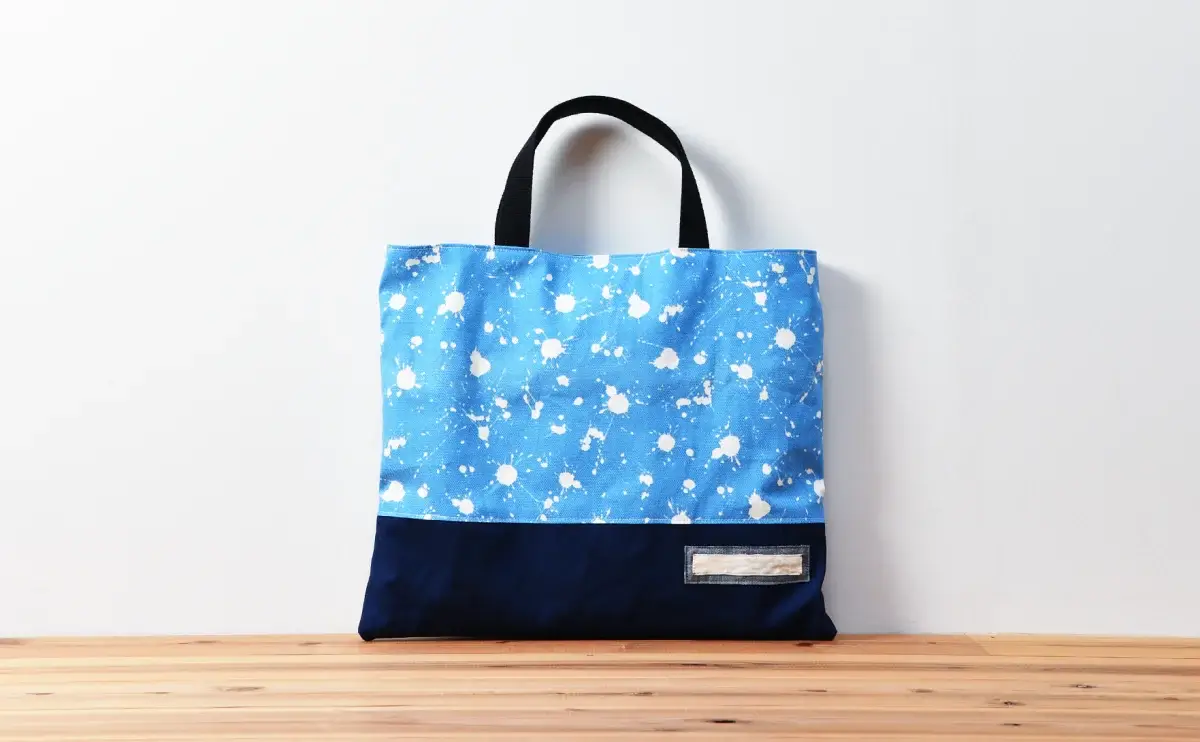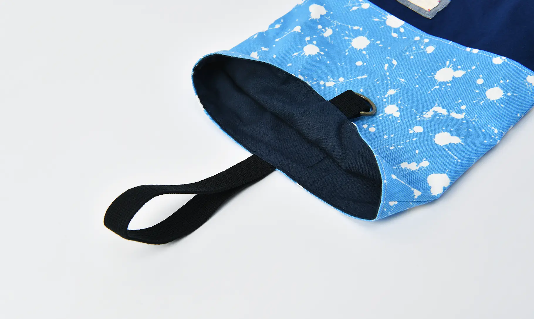 今回のオーダーは、躍動的でアーティスティックな生地「9001/白いペンキと水色」と、落ち着いたカラーの帆布生地「9073/帆布11号/ダークブルー」を統一してお選びいただいた、素敵な入園グッズセットに仕上がりましたので、一つずつ紹介いたします!