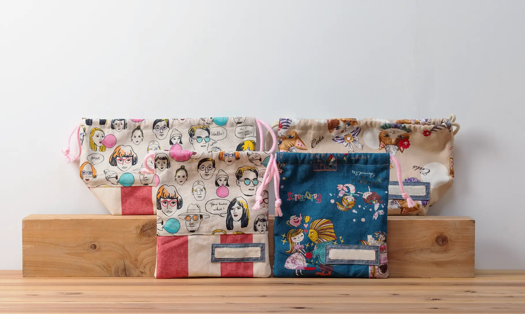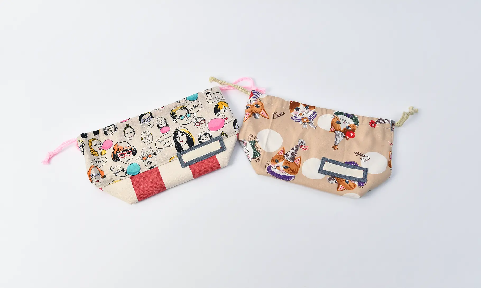 左の弁当袋は、先ほどのコップ袋同様の生地を使用しております。