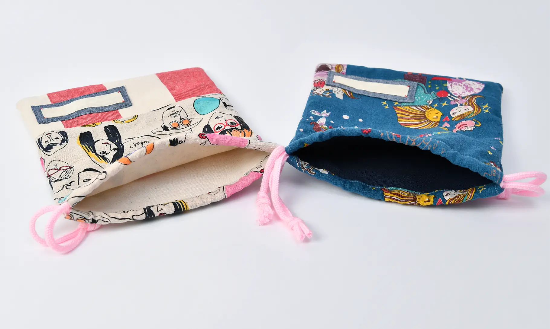 絞りひもはどちらにも「ピンク」を使用し、さらに今回は、両側から絞れる「両側巾着」をオーダーいただきました。