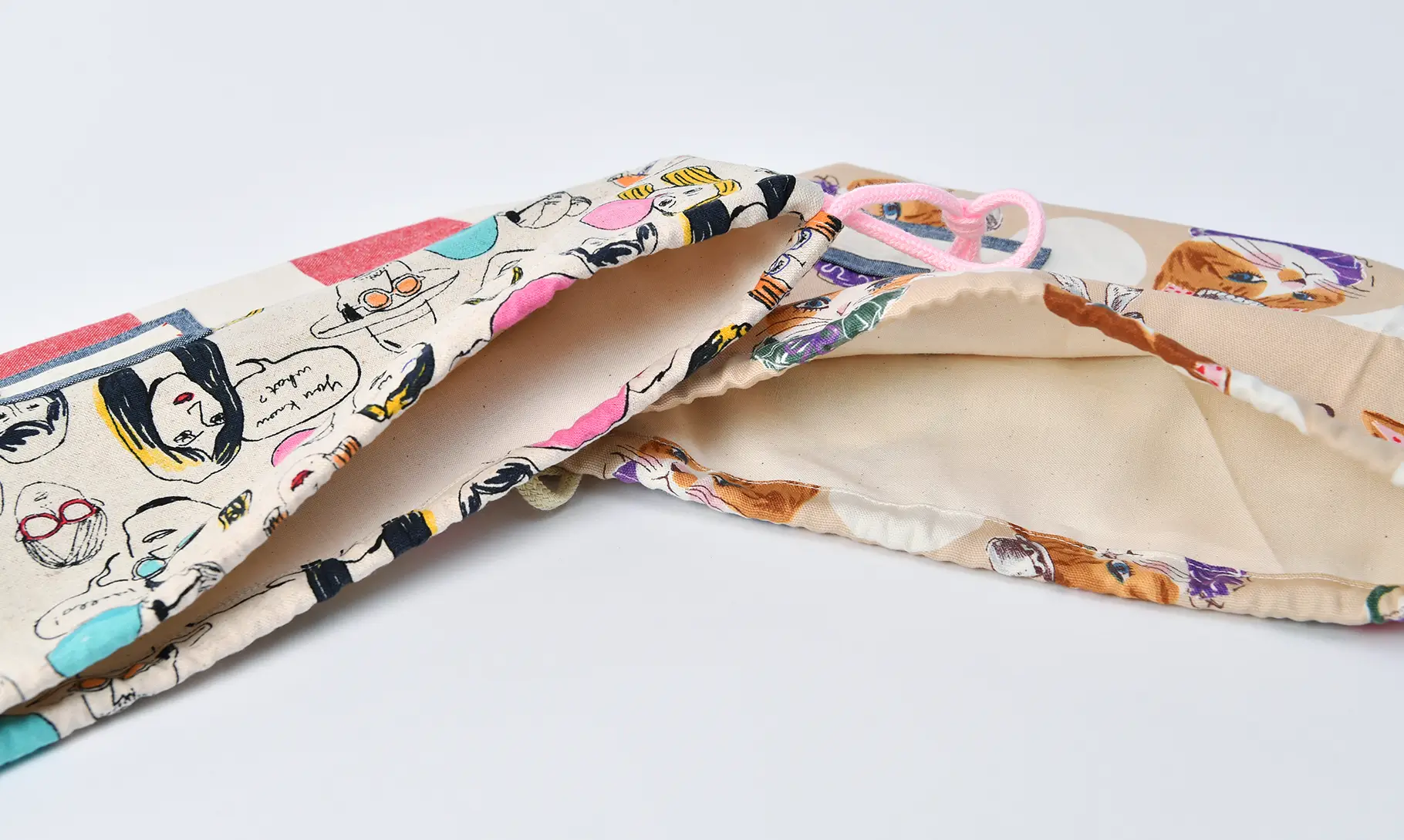 右の弁当袋は、上部下部ともに「9005/キャットパーティー(在庫なし)」、裏地に「きなり」をお選びいただきました。