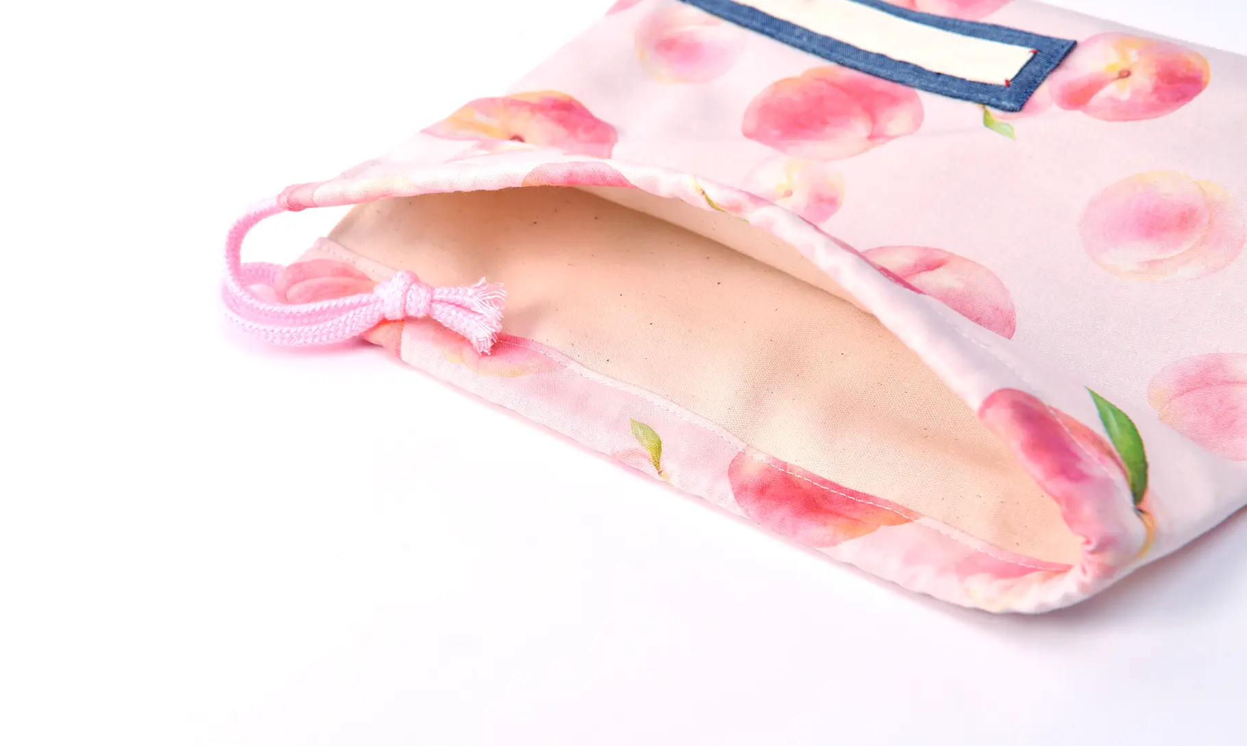 お選びいただいた生地は瑞々しく、とっても新鮮で美味しそうな、リアルな桃柄が特徴的な生地「0618/ももいろピーチ」です。