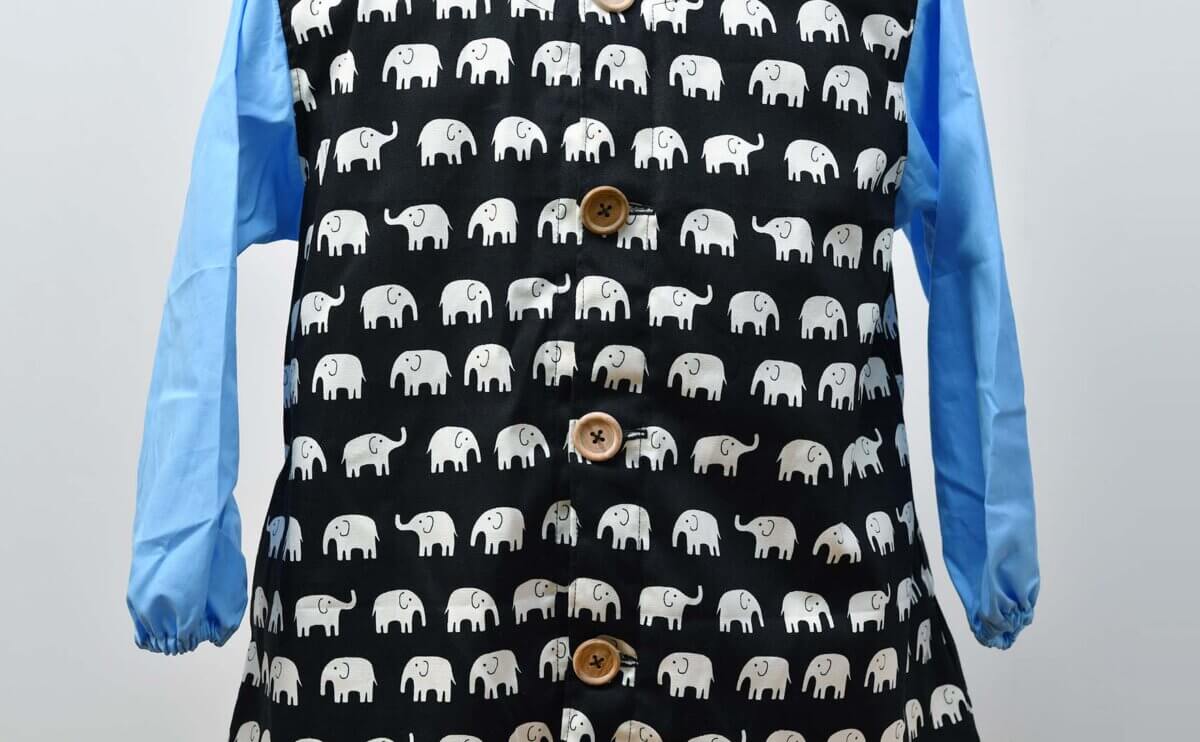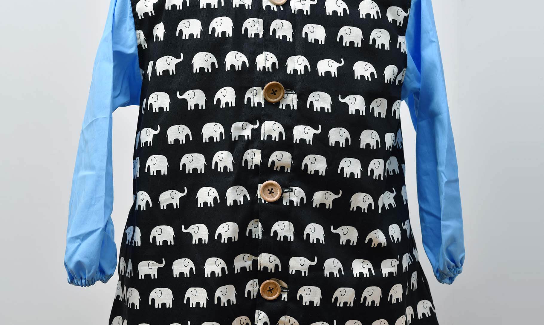 鼻を上げたり下げたり、動きのある可愛いゾウの生地をベースに、鮮やかなブルーの生地を両袖に組み合わせた、素敵なスモックをオーダーしていただきました!