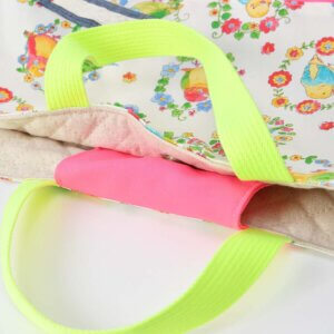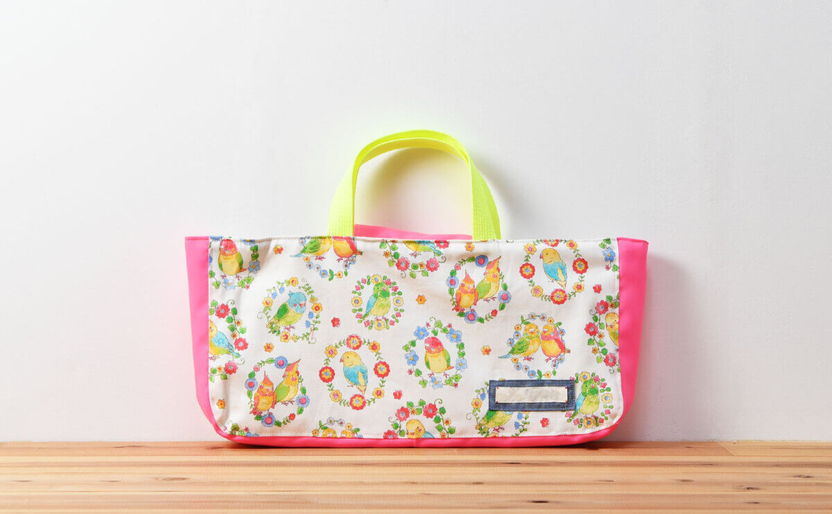 本体の生地には「0643/インコとリース」を、ふたとマチの生地には「9054/無地/蛍光ピンク」をお選びいただきました。