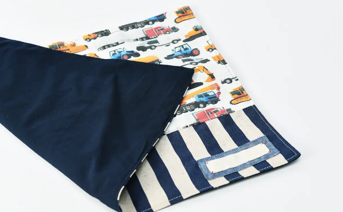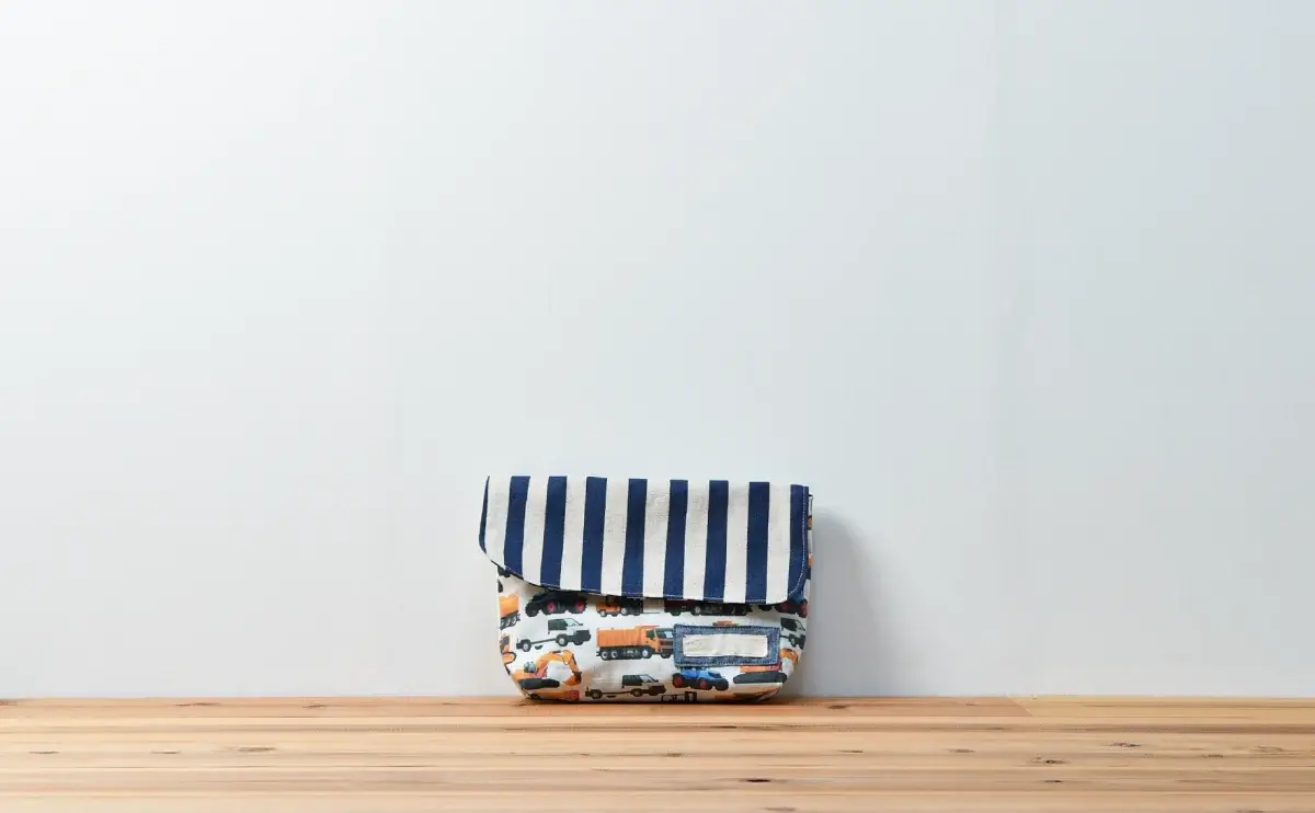 先ほどご紹介した封筒型弁当袋(2点目)と同じ生地で、上部には「0634/車柄インザワールド働く車」を、下部には「0620/ストライプダークネイビー」をお選びいただいております。