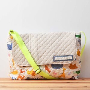 今回いただきましたオーダーでは、ふたの生地に 「9800/キルト /きなり」、本体の生地に「9824/キルト/カラフル動物園」をご選択いただき、お子様らしい素朴さや可愛らしさが溢れる素敵な通園バッグに仕上がりました。