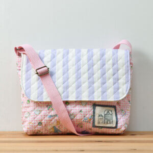 ゆめかわいさたっぷりの生地と、淡いパープルストライプの組み合わせが最高に可愛い通園バッグをオーダーいただきましたので、紹介いたします。