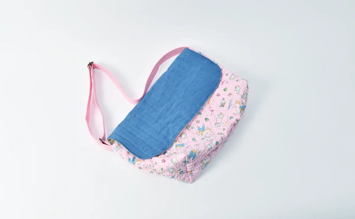 ふたの生地にお選びいただいた、一見デニムのような、彩度が低めの水色の生地がいいアクセントになっていて、その色味からは、少しだけお姉さんの雰囲気を感じます。