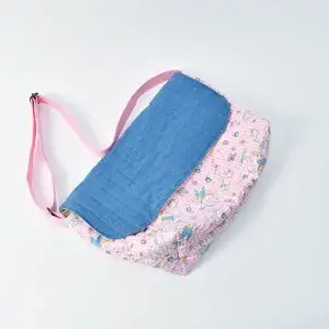 無地の水色生地と、ゆめかわいい生地の組み合わせが可愛くてオシャレな通園バッグをオーダーいただきましたので、紹介いたします。