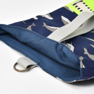 ネイビーのクジラと蛍光イエローの組み合わせ、蛍光イエローも目を引きます、グレーの持ち手もとても良く全体のバランスがすごく素敵な上履き入れのオーダーでした。