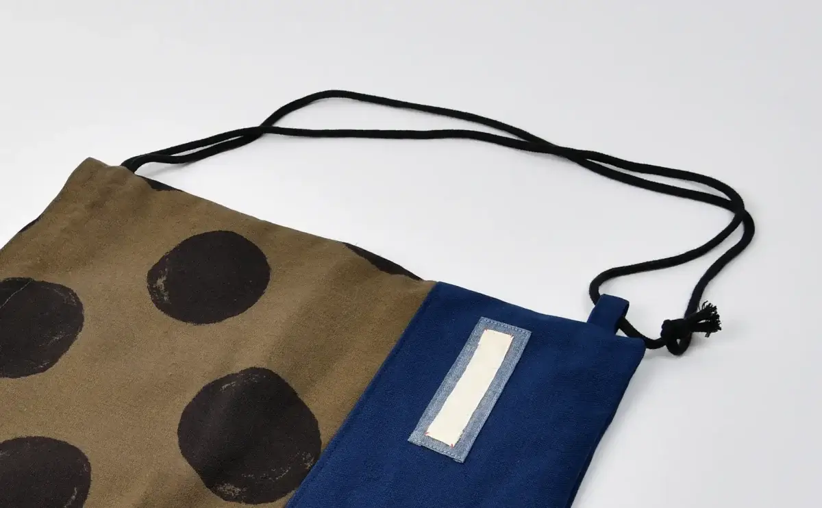 上の画像の巾着袋(右)は上下共に生地をお選び頂き上下切り替えにて製作しております。