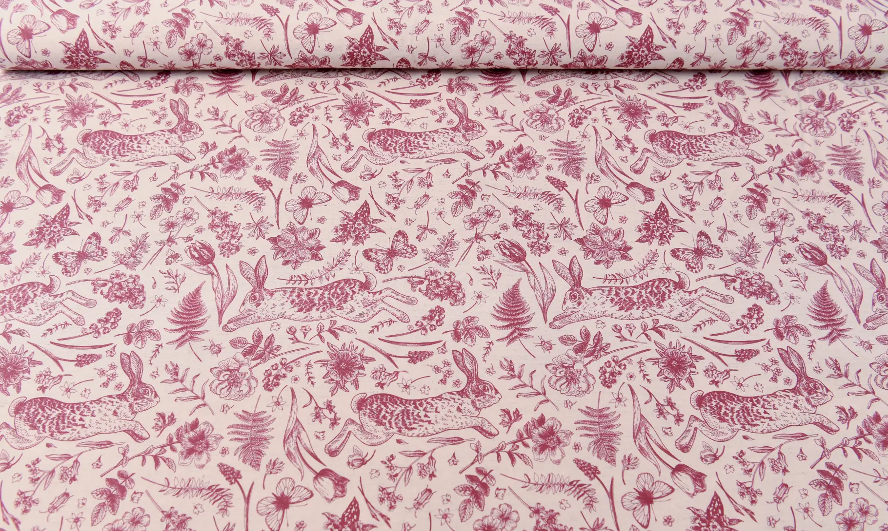 やわらかな生成りベージュの地に、深みのあるレッドで描かれたウサギや草花たち。