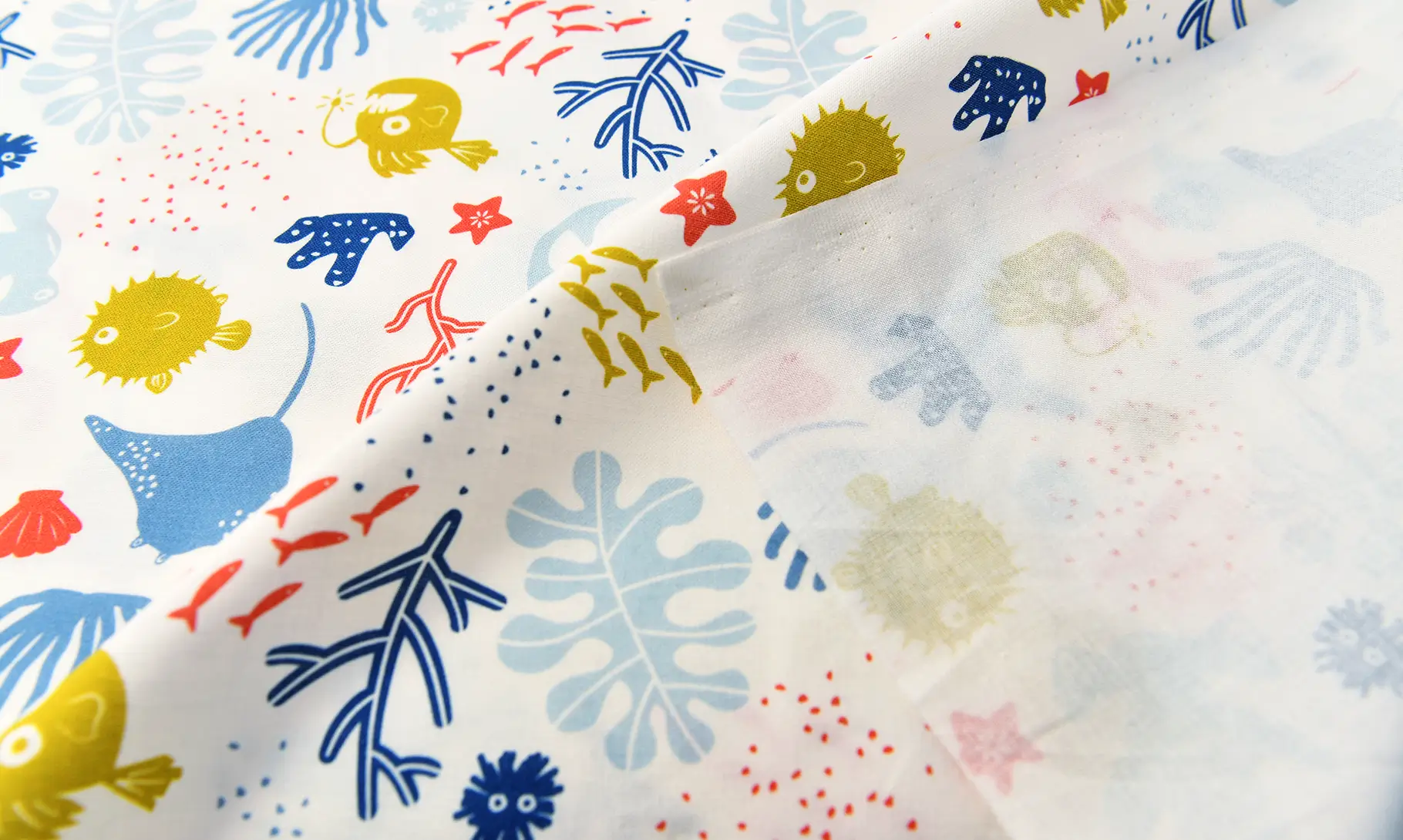 マンタ、ハリセンボン、珊瑚など、さまざまな海の仲間たちが、あちこちで自由に泳ぎ回り、図鑑を広げるように楽しめる生地です。